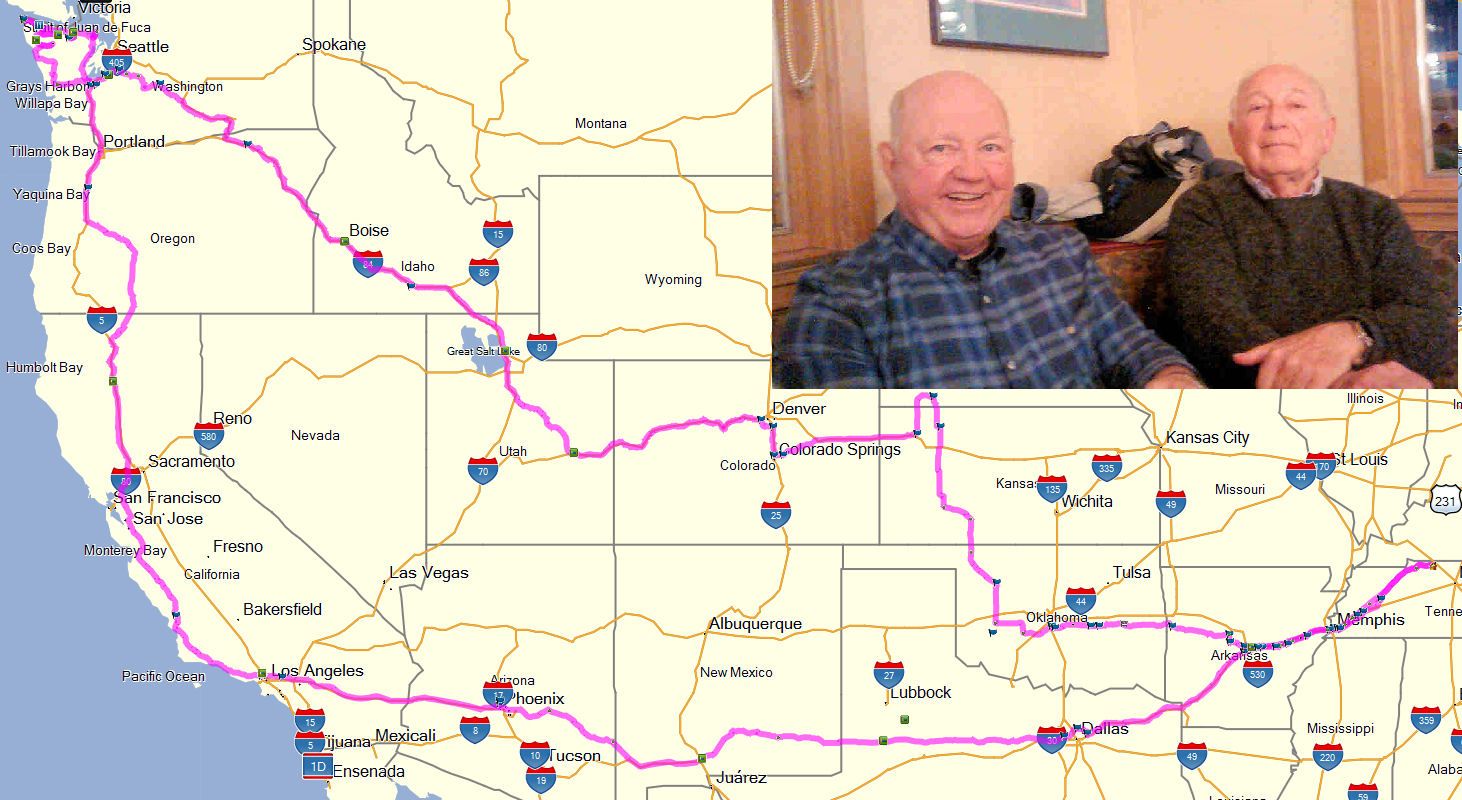 Here is his story. "Along the way I visited with family, friends, and classmates. In Lakewood, WA, I had dinner with Vic Yoakum and Nels Delisanti. In Colorado Springs, dinner with Andi Biancur, Jim Bujalski and Judy, Dick Schehr, and Jim Waddle."