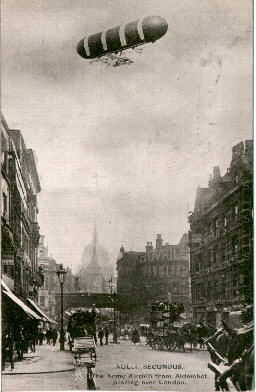 Below is a photo of 'Nulli Secundus' over London.