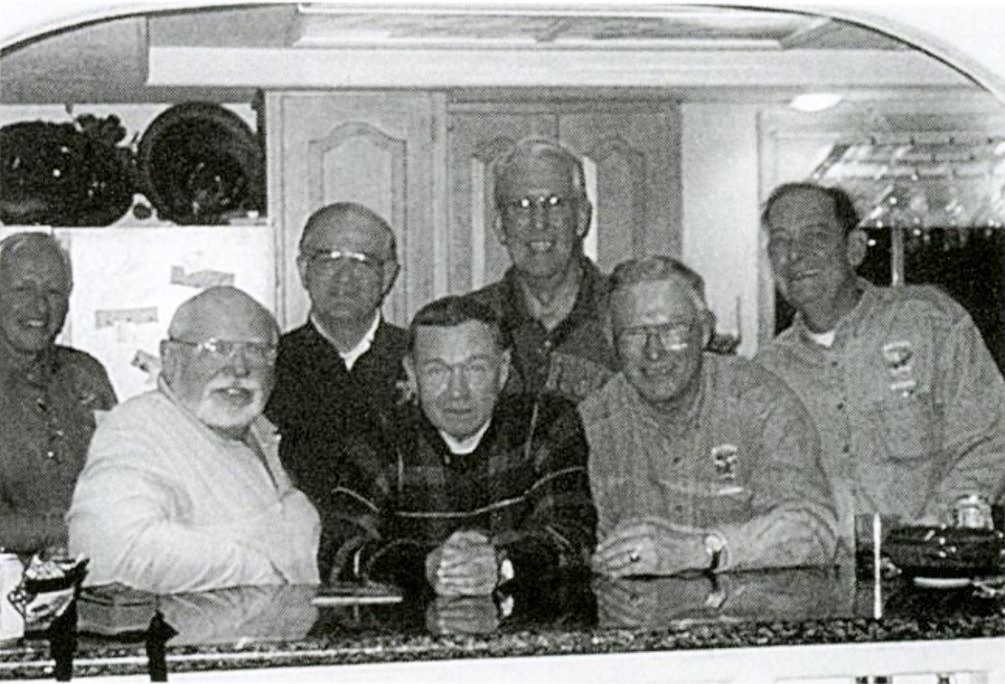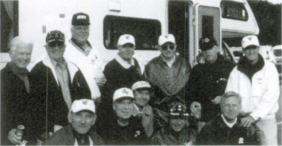 We squeaked by Navy 24-18 at Redskins Stadium the 6th of October. Ralph LALIME's Tioga minihome provided a "2111 century series rolling tailgate," reported harried passenger Bob BADGER. "Anyone who's ridden with Ralph knows that he does things with an RV that most people would never attempt in any kind of ground-bound vehicle, and most at high speed (the game always seems a little anticlimactic in comparison). It's analogous to Winston Churchill saying that there is nothing so exhilarating as being shot at--and missed." The Flea provided transport to/ from the game and Prozac to quiet riders' nerves. Wives attended, and the guys are in the photo.