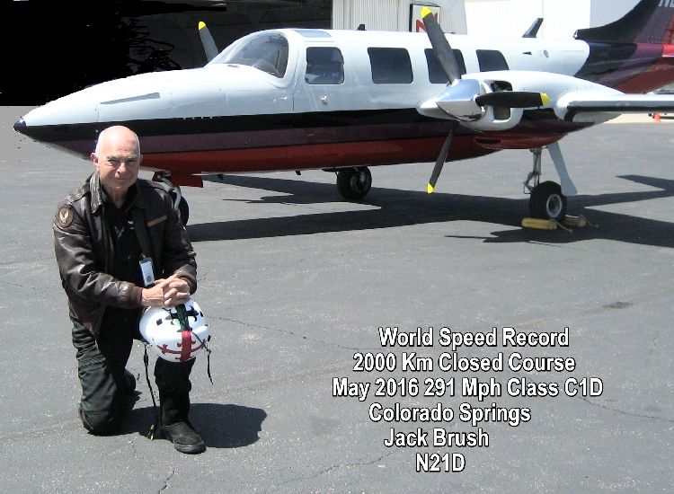 Jack Brush got his second, and last, world airplane speed record less than a year ago. His category was, "Class C1d, reciprocating aircraft less than 6800 lbs." Flying 1000 km out and back, Jack averaged 318 mph, 20 mph faster than standard Aerostars can fly with the same fuel flow. Now the airplane is primarily used for visiting grand kids. Jack recently wrote an aero paper on analytical deriving off-standard speed corrections and is currently seeking a publisher. At the same time his son, Jeffery, won a best paper award at an American Institute of Aeronautics and Astronautics conference, and he is one of nine finalists for the Collier Award from the National Aeronautic Association. This summer Jack plans a very low-level flight along the Lewis and Clark route from St Louis to the Pacific.