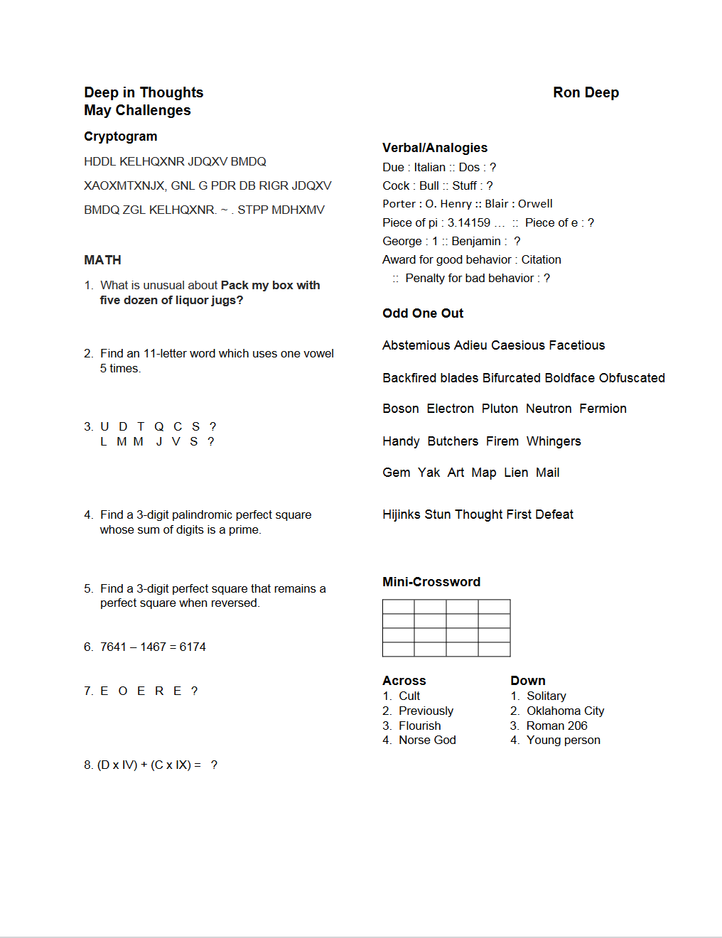 Here is a sample of the challenges that Ron Deep creates for his local MENSA folks: