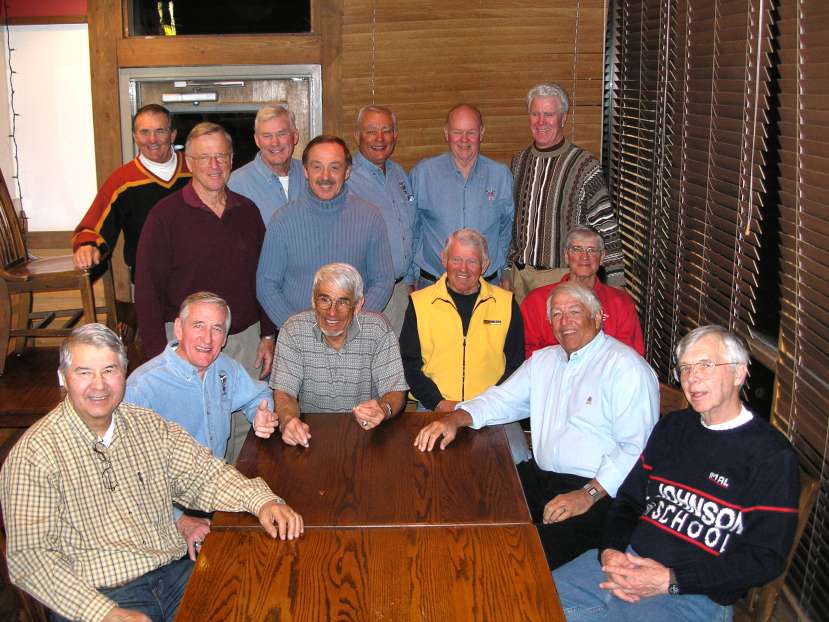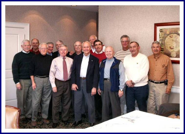 It was another great luncheon for the DC-'60 group, with fifteen in attendance at the January 15th 2008 get-together. "Bill Carnegie and Bob Odenweller had to cancel at the last moment; I guess the weather in North Jersey was a bit bleak. Al Johnson was coming, until an unexpected meeting with his builders required his presence in Maine," wrote Tony Burshnick. "Joe Higgins led off a great discussion on the proposed 50th Year Book. Ken Alnwick informed us where we are going with the Heritage Trail for our Class of 1960 gift. Mike Loh discussed problems with the AOG--those problems being money and fund raising. I'm glad to report that Bill Taylor is doing fine with his hip replacements. As is our latest patient, GJC Fries; he's walking three miles at a clip and seems well on the way to recovery (R: See "More Friendly Fire" later in this column for more on George). Bill Taylor got to see the USAFA/CAL game and was impressed by the Falcons, even if they lost. We were glad to have a former classmate, Bill Hockenberry, join us for lunch. Bill left in 1957, got a degree at Gettysburg College, joined the Army as an officer, then worked at Ford and eventually got a law degree, worked for the government, and is now a private lawyer here in VA. Tom Burke is working hard at becoming the most prolific grandfather and now has 13 grandchildren (Norm Haller is still two ahead of him)." (In the photo, left to right: Bill Hockenberry, Higgins, Querry, Lalime, Badger, Burke, Clarke, Fischer, Burshnick, Loh, Goodson, Taylor, Fries, de la Cruz. Ken Alnwick left before the photo was taken).