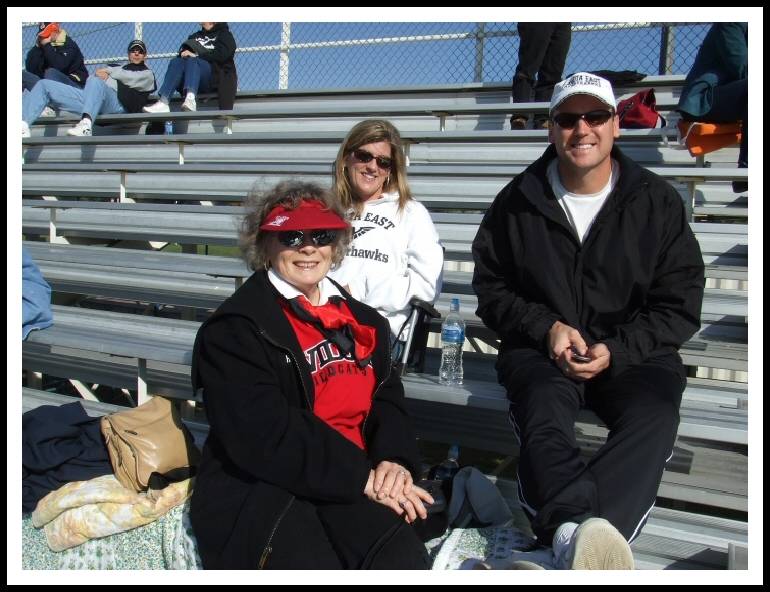 "Future college prospects include two other Sheehan boys, grandsons Nick and Matty, who play football in high- and junior-high schools in Loudon Valley, Virginia, and grandson Jeff Haller from the Cincinnati area, where he plays wide receiver for West Chester's Lakota High School JV team; Jeff is also a stand-out baseball player. (Third photo is Liz with son Richard and his wife Julie at their son Jeff's game--Richard and Julie are both USAFA grads, Class of 1988)