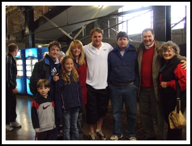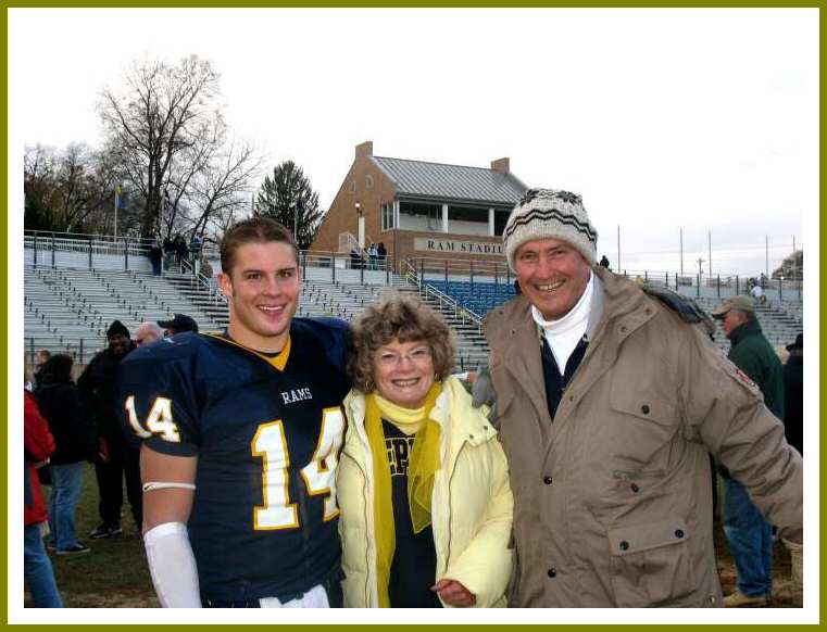 taken at Shepherd University,showing Liz and Norm with grandson John Sheehan); John's brother, junior Steve Sheehan, is at Harvard (R: "Never heard of it!") and plays safety; and sophomore Daniel Hauffe, at Davidson College (Division I, the "Wildcats") near Charlotte, North Carolina, plays defensive line. (See photo of Liz and Norm plus grandson Daniel--he's the tall one with white T-shirt after the Davidson-Butler game in Indianapolis; also in the photo is son Steve, his wife Shelley, and their family, who live nearby)