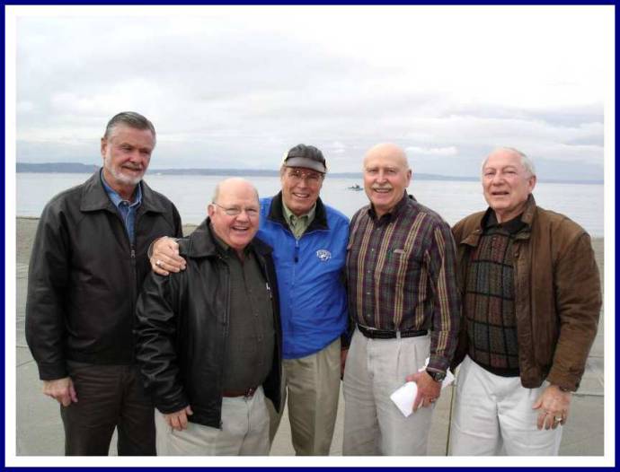 I was reminded of the old sawm>--"The Gods Must Have Been Out To Lunch"--when I saw this photo (R: don't know why, just always liked that little locution). George Luck has had several planning meetings regarding the Class History Book up in Washington State; one the 12th of December at Duke's in Seattle, this one in Mukilteo, WA at the Whidby Island Ferry Terminal on January 8th, 2008. George has been busily working on our Book for the 50th Reunion--now, he's collecting stories and information about those of our classmates who left prior to graduation, and tracking down their post-Academy years. But, some unexpected wisdom from that meeting came through Nels Delisanti, who sagely stated that "I guess we are now approaching that time of our lives when Mother Nature is going to extract her price for letting us get this far." (The photo has Dennis O'Keefe, Vic Yoakum, George Luck, Charlie Diver and Nels Delisanti.)