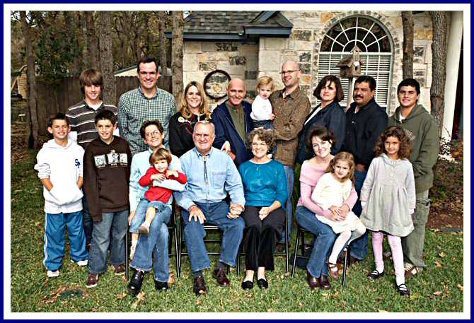 Sid and Marvann Newcomb recently made Footsteps Missions' trips to Costa Rica (R: You all, of course, remember that Sid was originally from San Jose, Costa Rica) and Reynosa, Mexico; travelled twice to Redwood City, CA, also went up to a lake house in Minnesota; and, extended his entrepreneurial ventures from tacos (Martinez Food Company) into formation of the M&N Livestock Company (three Angus cows, three calves, one bull, and 12-year and 22-year old horses named, appropriately, Joe and Gus, as well as "a partridge in a pear tree.") Sid also sent this great photo of his family, complete with explanatory: "On the left is our son Sid Paul (he teaches tennis, and is an assistant pastor in CA), his wife Linda is holding their daughter Tea; to Linda's right is their son Ty, and to Ty's right is his brother Payton. Behind my wife Marvann and me are daughter Holly (she works at National Instruments in Austin), and her husband Mike Drazich (a micro-biologist, recovering from lung and brain cancer). To Mike's left is son-in-law Adam Blumenshein (a partner in a medical supply company he started in Austin), Mike is holding his son Sammy; Adam's wife/our youngest daughter Danelle is to Marvann's left, holding their daughter Madelyn. On the right is our daughter Nanci and her husband Manuel Martinez, their son Noe and daughter Sidni (Nanci met Manuel when she was a Peace Corps volunteer in Honduras in 1987. Manuel became a US citizen after marrying Nanci and migrating to the USA 18 years ago). Manuel is my business partner in the Martinez Food Company which he and I started in the Houston area 10 years ago."