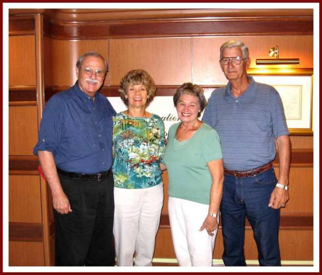 Friendly Fire. Retired from the DOJ in 2000, where he defended" the US in wrongful deaths, personal injury and aircraft-hull-loss lawsuits arising under the Federal Tort Claims Act," Bob Badger still consults in the field of aircraft crash litigation . . . Jim Glaza's 70th Birthday Cruise for our Classmates will be August 11-23, 2008, "Eastern Europe to the Black Sea" . . . John and Nancy Gonsky took a Caribbean cruise last January, spent a week in Cabo San Lucas in May and then toured Spain in September--John then bit-the-bullet and had a "total(right) knee replacement" on December 28th ('07) at the Lynchburg (VA) hospital where his daughter Linda is the anesthesiologist . . . Wordsmith Paul Vallerie reminded me that "level" and "kayak" are palindromes, and "dreamt" is the only English word ending in "mt." . . . From Bill Hales, who wrote that "On December 29th, 2007, Charlie and Kathy Liggett visited while on an East Coast trip. They were visiting family in the area, and we had them with us for a day. Good to see them, and they looked great. They are still living in California but thinking of retirement plans. It was our first classmate visit here in Greenville, SC, and we gave them the $2 tour" . . . Dave and Camille Sweigart write that "We've been on the road since Thanksgiving, when we went to Galveston, TX, then Cincinnati for Christmas and finally to Albuquerque, returning to Marble Falls, TX, this past Friday (12 January) only to have company over the weekend! We are now anchored here at home until our next scheduled journey to Italy in April, followed by a C-123 reunion at W-PAFB, OH in May." (See photo).