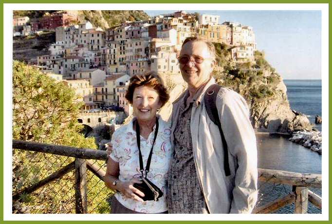 More Friendly Fire. The sprightly, youthful-looking and rapid-talking George Fries, ever optimistic, had his (right) hip replaced November 8th ('07) at Portsmouth Naval Hospital by some Navy Lieutenant Commander, and he (George) was so excited about his progress that he telephoned me in Sarasota a couple of days before Christmas: "My last marathon was in Hawaii in 1993, and I'll be running the next Boston Marathon this 2008!" (In a subsequent e-mail on January 26th, George said: "No on the 'Boston Big one.' I'm just enjoying the three-mile walks and 30-minute swims. Will visit Dean Bristow during the 2009 Mini- Ski, and I'm going to make both the Navy Game and the Army game this Fall" . . . Les Hobgood, who devotes an inordinate amount of time to matters of minor pith, recently posed this question to himself: "Self, how many Corvettes could we get on an aircraft carrier?" Joining 30 other Corvettes from San Antonio to support the (very large) Corpus Christi Corvette Club, they all went charging up the ramp to the USS Lexington and finished with 304 Corvettes on the Lex's flight deck: "Focus on Vettes and Jets on the Lex," it was called . . . Eve and Frank Mayberry travelled a little this last year (what's new?), and in '07 it was to Australia in February; July to Steamboat Springs, CO; September to Portugal and Spain; November Italy; and then, at Savona, boarding the Costa Fortuna cruise liner for their tripping back to Ft. Lauderdale (w/ stops in Tenerife, St. Maarten, Guadaloupe, Dominican Republic and Nassau. In the photo below Eve and Frank are at Manarola, Cinque Terre, Italy) . . . Bill Gillis writes from Panama City,FL, relating that "we now have a TV on our sport fishing boat to 'disappear on.' Sons Glen and Sebastian and I went sailing before the cold snap arrived, and we all went out to Shell Island on our neighbor's 'Regal' but had to leave the beach to annoying little bugs." (Ah, yes, the "Lifestyles of the Rich and Famous").