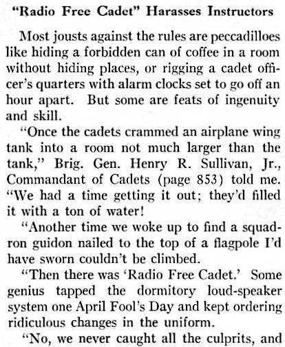 Frank Gorham sent in a story from a 1959 issue of the National Geographic Magazine (see item below). "I've enclosed the story entitled 'Where Falcons Wear Air Force Dress Blue,' go to the paragraph entitled 'Radio Free Cadet' on the lower right hand side of the page--it tells you about the day when Tom Pattie and I tapped into the intercom system at Lowry (see page 855 on the link: http://www.usafatoday.com/scans/natgeo1959/). Frank was browsing in an antique mall in Chipley, FL when he came across the article). The Fourth squadron PA wiring ran thru my closet in our room. We had access to a tape recorder, so we tapped into the wiring with a recorded message cancelling Freshman Inspections. In order to sound legitimate we preceded it with the usual announcement of uniform for the evening meal. With several minutes of blank recording before and after, we turned it on just before going downstairs for the usual hallway harassment of Special Inspection