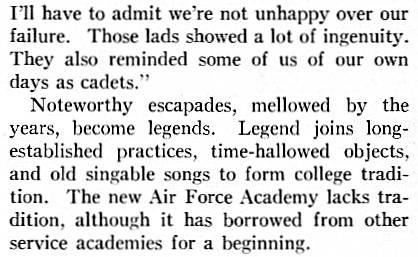 "Sure enough, shortly after the 'run your chins in dumb smacks,' the tape began with 'Attention in the area! Attention in the area! The uniform for the evening meal will be (whatever it was). Freshman Inspections for this evening are canceled.' We kept a straight face and were dismissed to return to our rooms. We thought the broadcast would only take place in our own dorm; but, it turned out that it reached across the quadrangle at least to Third Squadron. The net result was confusion on the quadrangle as different dorms showed up in different uniforms for dinner formation--depending upon whether they had received our bogus uniform announcement, or not." Further, Frank swears he had absolutely nothing to do with painting the D.U. stadium while we were at Lowry, or with that Blue statue at Colorado College. Who were the real culprits? (R: Stay tuned).