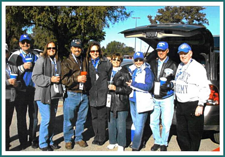 George Pupich went on to forecast the Falcons' football future: "That was a mighty good football team for Cal that beat us. I guarantee that at least four of Cal's players will be high draft choices. That magnificent offensive line of theirs was something else. I also talked with Falcon Coach Troy Calhoun ('89) at the hotel after the game, and he had his reasons for going for two points near the end. If we went for one and then scored on a touchdown, plus an extra point, the score would have been 44-42 in our favor; they could then beat us by one with a field goal. Should we have had this same scenario, but went for and made the two-pointer (making it 42-37), plus scored as described before, they could have only tied us. Granted it was an unlikely script, but once again, he was thinking ahead of all of us. So, we went for two." George predicted that "The next two years will be lean ones for our Academy football team. We do have a few good doolies and a good bunch coming up from the prep school, but there are some big holes that will take time to cover up." (In the photo taken at the tailgate prior to the game are Liz Haney (partial, w/ Bloody Mary shown), Tom Kroboth, Carole & Dave Hardy (friends of Jen), Jenny Glaza, Jan Kroboth, Deanne McCullough, Jim Glaza and Denis Haney--John McCullough was also there somewhere, hiding).