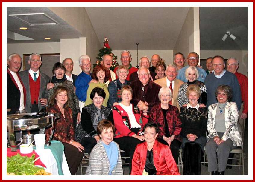 "A snowy evening did not prevent the Colorado contingent of the Class from gathering on 8 December 2007 at the Waddle's community club house," wrote Class President Andi Biancur. "Once again, Carole Biancur and Jeanette Glaza performed miracles by creating a very festive atmosphere. We were fortunate to have 12 classmates and their 'significant others' attend, along with three couples from the Class of '59. The great food and ample bar finally gave way to an entertaining session of 'Combat White Elephant' (*), making for an overall successful preview to the holidays. We were fortunate to have RG Head and Carol Hoover join us, as they were in town for another occasion. Those attending: Duck & Mary Waddle, John & Deanne McCullough, Barb & Wayne Kendall, Fran & Bill Hodson, Ron & Connie Yates, Jim & Jeanette Glaza, Andi & Carole Biancur, George & Diana Pupich, Jim & Judy Bujalski, Fred Porter, Steve Bishop & Kathy Toucher (Norm Haller's sister-in-law), while Brock & Claire Strom, Ed & Lucia Montgomery, Max & Trix Miller from '59 were present to provide adult leadership." (In the photo: Front Row--Fran Hodson, Lucia Montgomery; Second Row--Jeannette Glaza, Barb Kendall, Judy Bujalski, Deanne McCullough, Connie Yates, Diana Pupich; Third Row--Trix Miller, Carol Hoover, Mary Waddle, Jim Bujalski, Ron Yates, Claire Strom, Bill Hodson; Back Row--Jim Glaza, Ed Montgomery, Max Miller, RG Head, Wayne Kendall, Jim Waddle, Andi Biancur, Steve Bishop, Carole Biancur, John McCullough, George Pupich, Brock Strom, Fred Porter). *(For an explanation of "Combat White Elephant,"" contact Andi Biancur. While you've got Andi on the line, sign up to attend MiniSki XVIII March 1-8, 2008 on the powdery slopes of Utah).