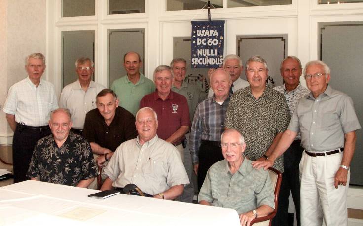 "It's hard to believe that 52 years ago, July 9, 1956, we all met for the first time at Lowry AFB," wrote Tony Burshnick. "We met to recount some of our memories, and had another great luncheon. Despite being slowed down by Parkinson's, Charlie Holman flew up from Alabama. Charlie mentioned the five guys that helped get him through USAFA: Don Thurman, Mike Love, Ken Alnwick, Al Johnson, and "Yours Truly." The luncheon had fourteen in attendance. Doug Rekenthaler has his medical problems, Bob Odenweller is recovering from a root canal, and work got the best of Haller, Clarke, Loh and Taylor. Bill Carnegie is moving to VA and having a house built at Lake Frederick, taking temporary residence west of DC. Joe and Sue Higgins came from SW Virginia, so Karen, Betty de la Cruz, Gale Johnson, and Liliane Badger joined Sue for lunch. Ken Alnwick gave a nice pitch on the Air Force Historical Foundation, which is working hard to preserve the AF heritage. GJC Fries is just back from Hawaii, while Leon Goodson is working about 70% of the time, and he and Maryn lent their singing talents to his church choir and recently travelled to Europe to perform concerts in Latvia, Estonia, Sweden and Saint Petersburg. Joe Higgins is becoming a life style change expert, moving every couple of years to different type houses; by the way, Joe's dad is 101! Ralph Lalime will soon be welcoming his second granddaughter, and Ralph and Darlene will head to CA for the blessed event this fall. Al Johnson told of a rickshaw race he won against the Navy back in the RVN days; his house in Maine is (finally!) finished. Bob Badger has finished his first book, and now needs to get it published. Tom Burke's wife Mary underwent quadruple heart bypass surgery, and the operation was a success. Bob Fischer's daughter is expecting grandchild number seven in October. Jerry and Betty de la Cruz have been to Green Bay and will soon head to Texas for a visit. Our (Tony's & Karen's) daughter, Kris, presented us with grand daughter Lily in early June--that's number two for her; son Joe, an ART, transferred to Dobbins AFB, GA, serves with the 22nd AF Reserve, and just checked out in the C-17 and will fly out of Charleston AFB." (Photo: Back--Badger, Johnson, Higgins, Lalime, Hockenberry, Fischer; Middle Row-- Fries, Burke, Goodson, de la Cruz, Querry; Front Row�Alnwick, Burshnick, Holman).