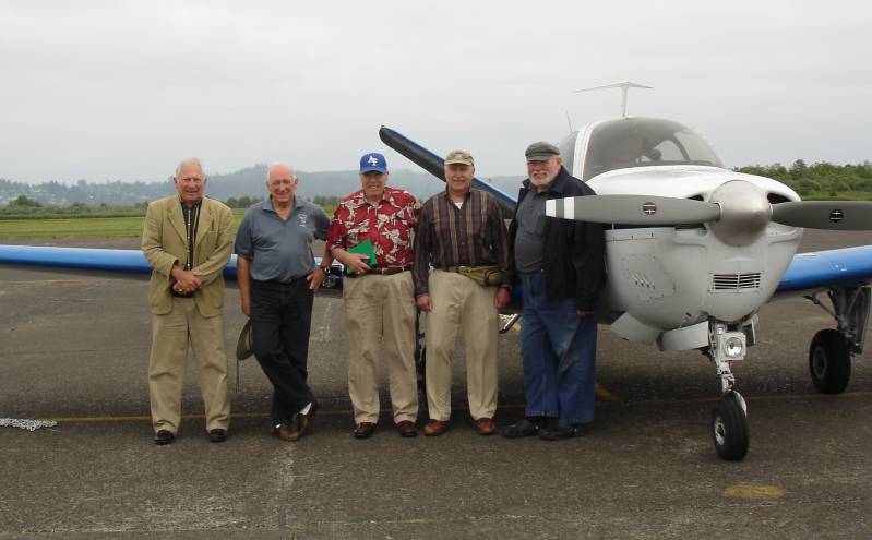 "On June 30th, I flew to Skagitt, WA to pick up Chuck Diver, and then to Tacoma Narrows, WA for Jim O'Rourke and Nels Delisanti, then flew to Astoria, OR to visit Ed Leonard on the shore of the Columbia River," said George Luck.(Photo: Nels, Jim, George, Chuck, Ed).