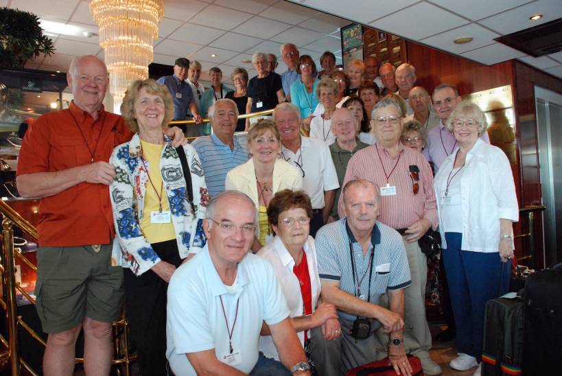"The cruise provided the chance to experience life in several countries previously known as the Soviet Bloc. Food and accommodations were nice, but the best part was sharing it with classmates. We had a lot of laughs, and got through the usual minor glitches. At an afternoon gathering we raised a glass of bubbly in recognition of our 70th Birthday--whether in 2008 or not--and took this great photo." (Photo--read names left to right and first up and then down: Greg Boyington, June Colgan, Brian Kaley, J.T. Smith, Diane Smith, Bruce Mosier, Andi Biancur, Caryl Mosier, Ann Flygare, Carole Biancur, Kay Vallerie, Ron Yates, George Pupich, Gordy Flygare, Lutzi Fischer, Carol Kaley, Diana Pupich, Connie Yates, Denny Haney, Jeannette Glaza, Paul Vallerie, Walt Futch, Kathy Liggett (hidden), Pat & Earl Van Inwegen, Barbara Peebles, Bob Fischer, John Peebles, Charlie Liggett, Barbara MacDonald, Russ MacDonald, Elaine Futch; Missing: Jim Glaza, Liz Haney, Dale & Ina Thompson.)