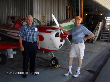 "Jim and Judy Bujalski were spending the month of August at Judy's house in Littleton, CO, and invited me to visit," writes Gary Van Singel. "I flew out and took my friends Pete and Sharon Hoekstra from Grant, MI, since they have a son living in Littleton. I arrived in Denver 08/05/08, and Jim and Judy took me to their gated community overlooking a golf course and a beautiful mountain view. Wednesday it was up to those wonderful Colorado Mountains and Judy's cabin near Fairplay at 10,000 feet, Thursday a whitewater raft ride on the Arkansas River between Buena Vista and Salida (photo--Gary's wearing baseball cap, Jim fishing cap), picnic lunch at Arapahoe Basin (where I/we learned to ski in '56), Saturday at Lowry AFB's AFA Museum in Hanger # 2, then sailing on a reservoir. Sunday it was church in Pueblo, and Monday Jim and I met Tony Bilello at Centennial Airport's restaurant (photo--Jim with Tony and his Ercoupe). I flew home to Michigan on Tuesday to a houseful of grandkids raiding my refrigerator!"