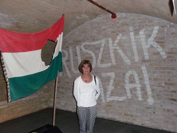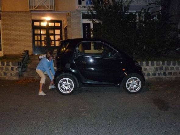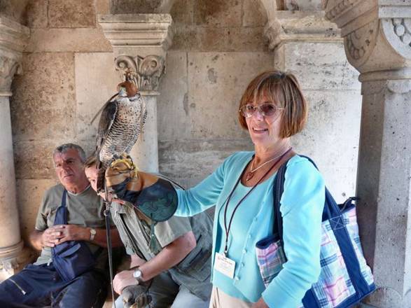"Lutzi and I spent three days in Budapest, Hungary, then went to Lutzi's birthplace and home city for three days in Szekesfehervar, which was the original capital city," wrote Bob Fischer. "We visited her cousin, brother, niece and their families, while enjoying great Hungarian food and wine. Lots of Hungarian was spoken, very little English, but, I managed with some of my German," said Bob, who met Lutzi on a blind date* at the University of Colorado." Lutzi's Hungarian maiden name is Marta Lutzi Gabriella ZsuZsa Hortobagyi. She did some Judo, has a B.S. in Biology with a Minor in Modern Dance, excelled in Ballet and Ice Skating, and was an Alternate for the 1956 Olympics as a Gymnast. (First photo shows Lutzi with a Hungarian flag from the 1956 revolution at the House of Terror in Budapest--"I climbed up a tree during International Week at CU and cut out the hammer and sickle, which was the Commie symbol;" second photo shows Lutzi--unsuccessfully--trying to lift a 'Smart Car;' lastly, she's having luck taming a Falcon, used in Hungary for hunting).