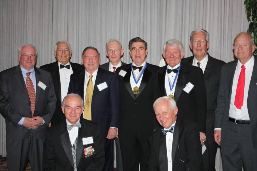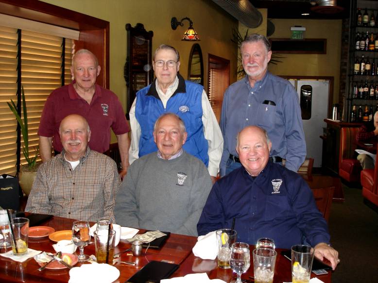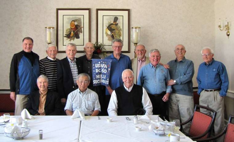 "We had a great luncheon to celebrate the anniversary of President Eisenhower's signing the law that created the USAFA. Falling close to Easter," wrote Tony Burshnick, "we had a few celebrating the holiday away from Virginia. Ralph and Darlene Lalime are at their favorite resort on Sanibel Island, FL (celebrated son Chris" marriage to Robyn in January). Bob and Lutzi Fischer were at Marco Island, FL and then spent time with Rosie and Karen Cler. Mike Loh recovers from an abdominal hernia. Bob Odenweller is busy getting his stamp and book awards. Al Johnson decided to vacation in Maine. George Fries was in California, and Bill Goodyear and Bill Hales decided to stay down South. Joe Higgins's mother-in-law was "under the weather", so he and Sue stayed home. Leon Goodson's Mom died, so he and Maryn were en route to Oklahoma, after celebrating the birth of twin grandchildren, Isaac and Pippa. Ben Furuta joined us, as he was in town celebrating the birth of his grandson. Ben talked of his life in LA after leaving the Air Force in the sixties; Ben's wife's from Japan, so she had a double delight in seeing the new grandson, plus enjoying the Cherry Blossom Festival. Mike A. Clarke made it to lunch with Norm Haller's help. Mike is about 80% of normal, and may return to work by June; his vision is still impaired, and the VA is helping him obtain devices and vision classes; Mike's wife, Nancy, will judge next year's Tournament of Roses. Bill Carnegie is recovering from his non-Hodgkin's lymphoma. Ken Alnwick encourages those with an illness traced to Viet Nam to petition the VA for tax relief; also, Ken is working on a project that requires people to make predictions on what will happen in the world by 2025. Bill and Kitty Taylor are heading to Dallas for a final move into retirement--he will still work for Rand in Dallas. Badgers are fine, and Bob needs an agent for his book. Les Querry filled us in on Joe Yeager's story, and Les had also talked to Ace Holman; Ace had a relapse, but is OK. Bill Hockenberry says life is good! Jerry de la Cruz gave a rundown on events at Al Johnson's Ski School. Norm Haller is involved with the National Academy and Randolph-Macon. Tom Burke, announced the birth of his twelfth grandchild, and may catch Norm one day. Tom is President/CEO of AVMAK, and may have to take the company into bankruptcy. Our next meeting is 9 July."