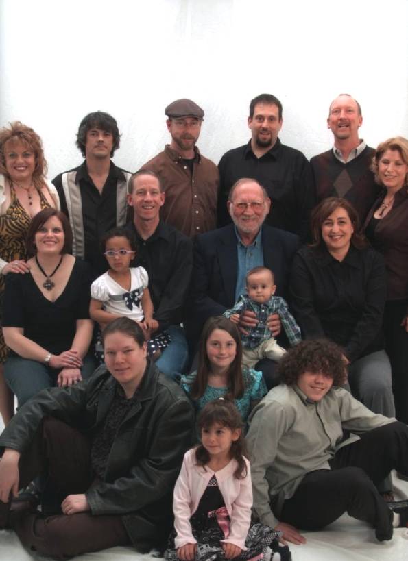 "Spring is here. That means winds! The tumbleweed races are in full tilt, a few kamikaze weeds attacking cars, and we had gusts to 59 mph. Winds collapsed a tent at the annual Pork & Brew in Rio Rancho," says Bill Leninger, who's used to New Mexico's 'wind-in-the-spring.' "My son Todd is visiting from Portland, after nine weeks throughout Europe visiting Art museums. We celebrated family tradition by taking this portrait." Back--Rene (adoptee), Don (Rene's husband), Todd (son), Marco (Dorene's husband) Tony (son), Yvette (Tony's wife); Next"Lynn (Bill's wife), Kajan (Bill & Lynn's daughter adoptee), Bill (son), ME, Angelo's on his lap (son of Dorene & Marco), Dorene (adoptee); Front--Chris (Yvette's son), Grace (Bill & Lynn's daughter), Sam (Rene's son). Very front--JoEllen (Bill & Lynn's daughter, adoptee).