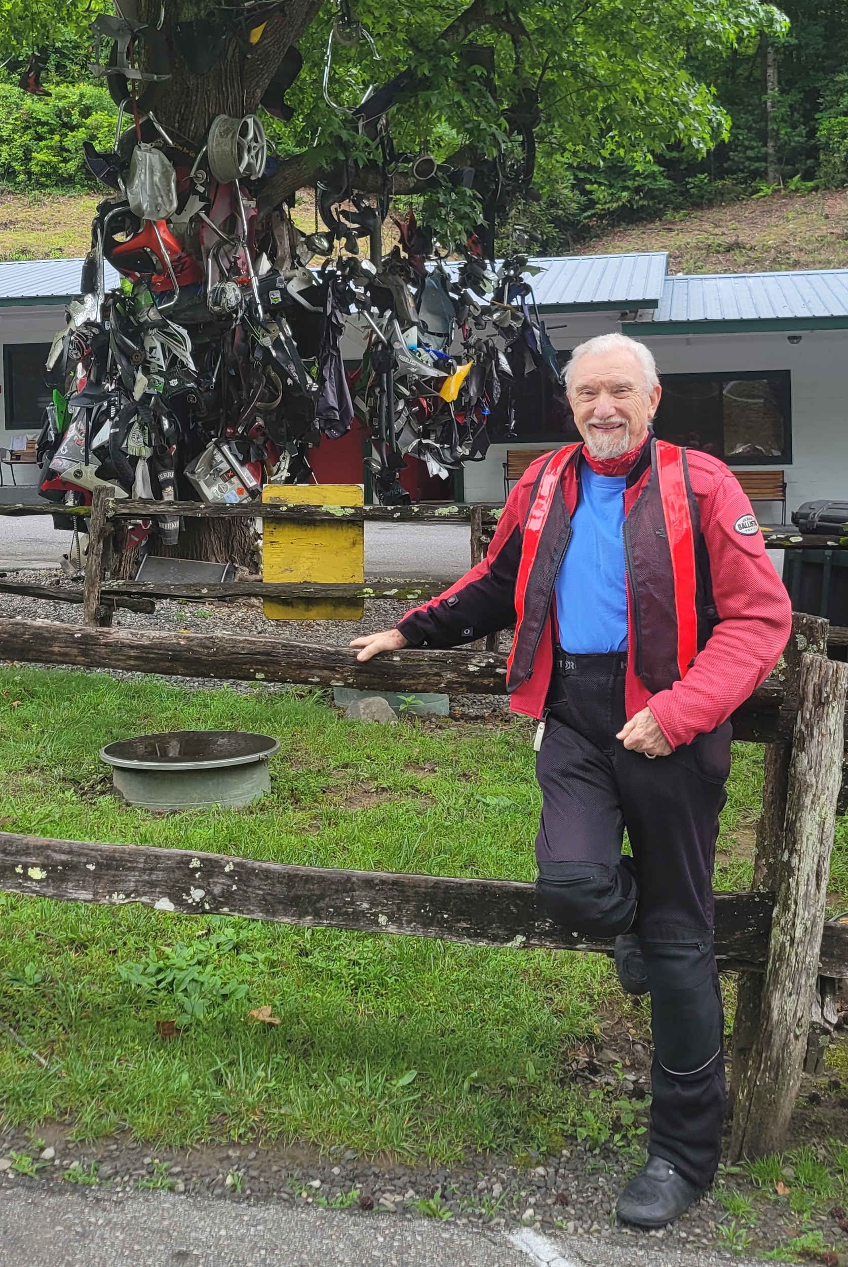 J.T. Smith rode one of his motorcycles to the annual gathering in early June of his motorcycle group Los Guajolotes. A friend from Utah flew to Nashville to ride another of his motorcycles. This year the group assembled in Townsend, TN to enjoy riding the twisty roads in the area. One such road is the infamous “Tail of the Dragon” which is a section of US-129 through Deals Gap that connects Tennessee and North Carolina. Boasting 318 turns in its 11-mile course, it is arguably one of the most exciting-yet-treacherous rides in the country. To mark the treacherous nature stands “The Tree of Shame” at the Deals Gap Motel at the southern end of the “Tail.” It is adorned with many motorcycle parts gathered from the numerous crashes that have occurred over the years.