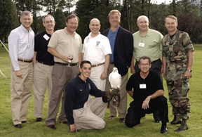 '75ers at first Graduate Leadership Conference. L to R: Bentley Rayburn, Bruce Mitchell, Scott Hente, Jim Carlson, Rich Chanick, Rod Hennek, Dale Meyerrose. Mike Matte (kneeling) |